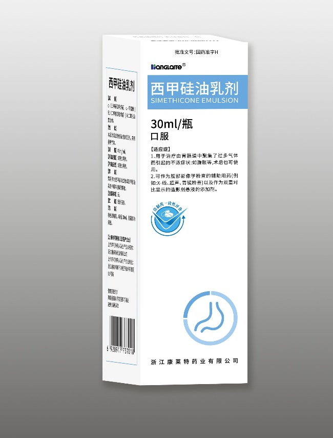 西甲硅油乳剂(Simethicon Emulsion)是一款口服乳剂,所含药理学活性成分聚二甲基硅氧烷作为消泡剂,可改变消化道中存在于食糜和粘液内气泡的表面张力,并使之分解,释放出的气体可被肠壁吸收,并通过肠蠕动排出。该产品可用于治疗由胃肠道中聚集了过多气体而引起的不适症状:如腹胀等;可作为腹部影像学检查的辅助用药(例如:X-线、超声、胃镜检查),以及作为双重对比显示的造影剂悬液的添加剂[1]。