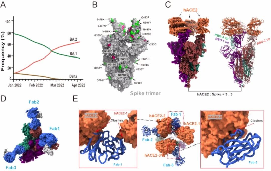 图1  A,2022年以来三种突变株新冠病毒感染占比变化图;B,Omicron BA.2 相对原始型的突变位点展示;C,Omicron BA.2突变株刺突蛋白三聚体结合受体3个ACE2的结构侧面展示;D,Omicron BA.2突变株刺突蛋白三聚体结合抗体JMB2002的结构顶面展示;E,抗体JMB2002阻碍人ACE2蛋白结合突刺蛋白图示。